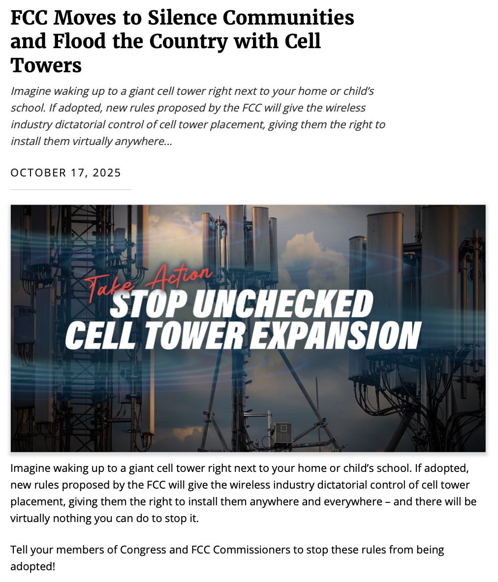 If allowed to pass, this rule change will unleash a tidal wave of small cell antennas and wireless installations across the nation – an infrastructure essential not just for faster wireless, but for a sprawling digital spy grid and social credit apparatus. The future of local control, public health, and privacy rights hangs in the balance.