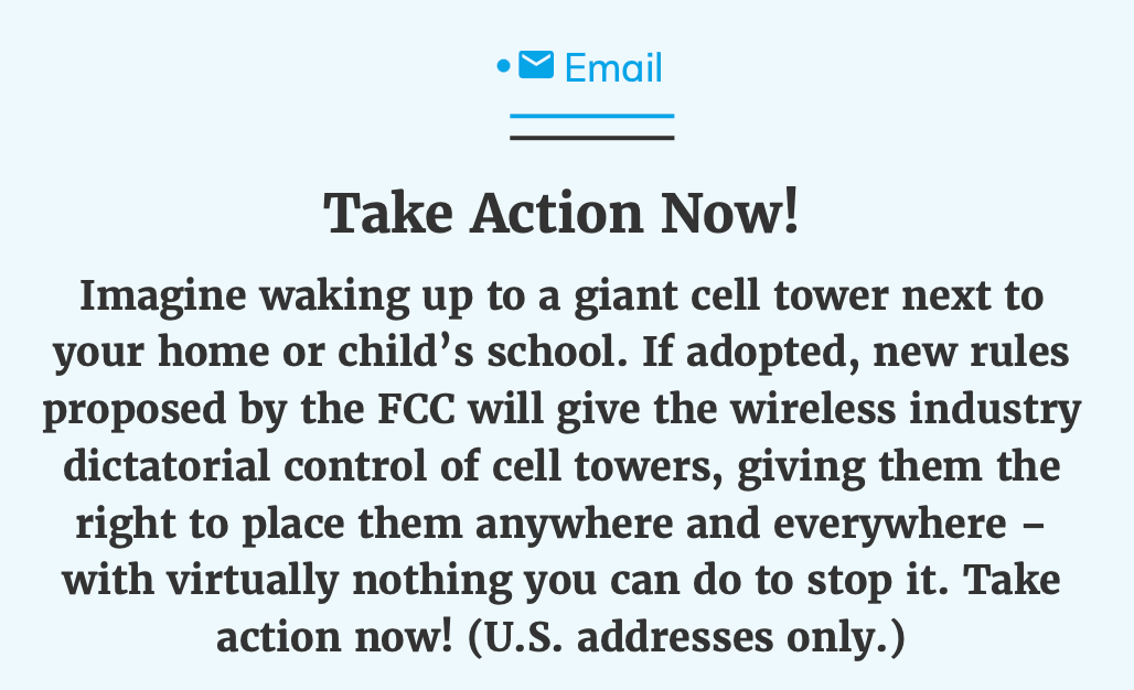 - Sign the petition to send to your legislators. Tell them to STOP UNABATED CELL TOWER EXPANSION ONCE AND FOR ALL!